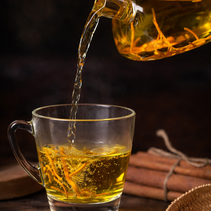 Trong trà thảo mộc và các sản phẩm chăm sóc sức khỏe, Đông Trùng Hạ Thảo thường được sử dụng dưới dạng sợi nấm sấy khô hoặc chiết xuất. Hương vị của nguyên liệu này khá nhẹ, mùi thảo mộc dịu, không gắt, phù hợp để kết hợp cùng các dược liệu khác trong những công thức cao cấp.