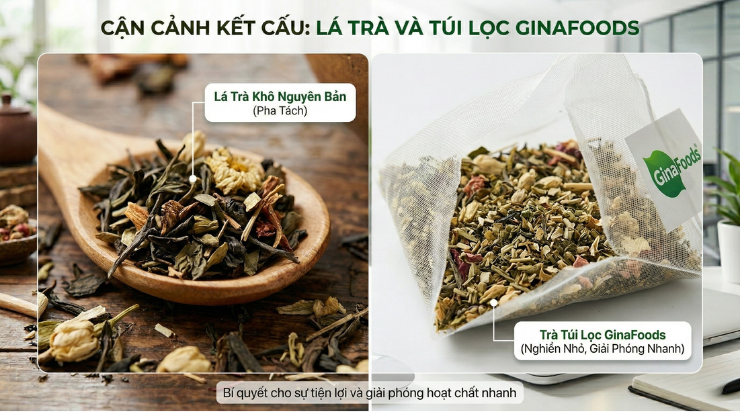 Trà lá truyền thống thường được đong đếm theo cảm tính “một bốc” hoặc “một nhúm”, dẫn đến nồng độ trà không ổn định. Trà thảo mộc túi lọc (như các dòng của GinaFoods) được định lượng sẵn (thường từ 2g–5g) dựa trên nghiên cứu về thể trạng, đảm bảo người dùng nhận được hàm lượng dược tính vừa đủ, hỗ trợ cơ thể một cách khoa học nhất.