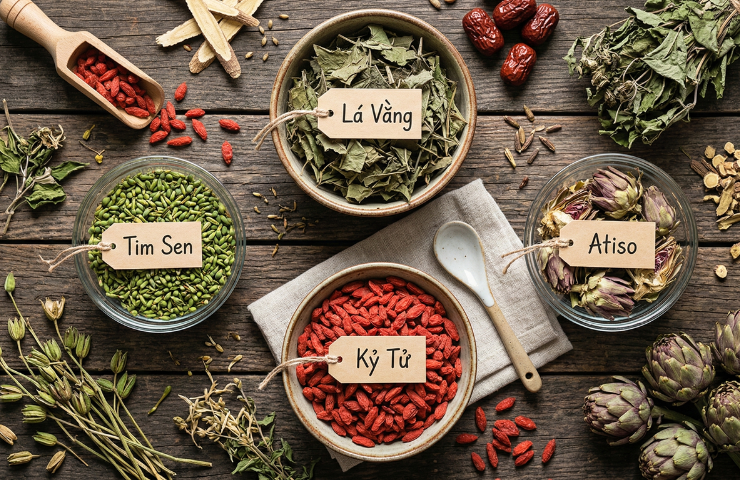 - Kỷ Tử: Bổ sung chất chống oxy hóa, hỗ trợ thị lực và làm dịu tinh thần.